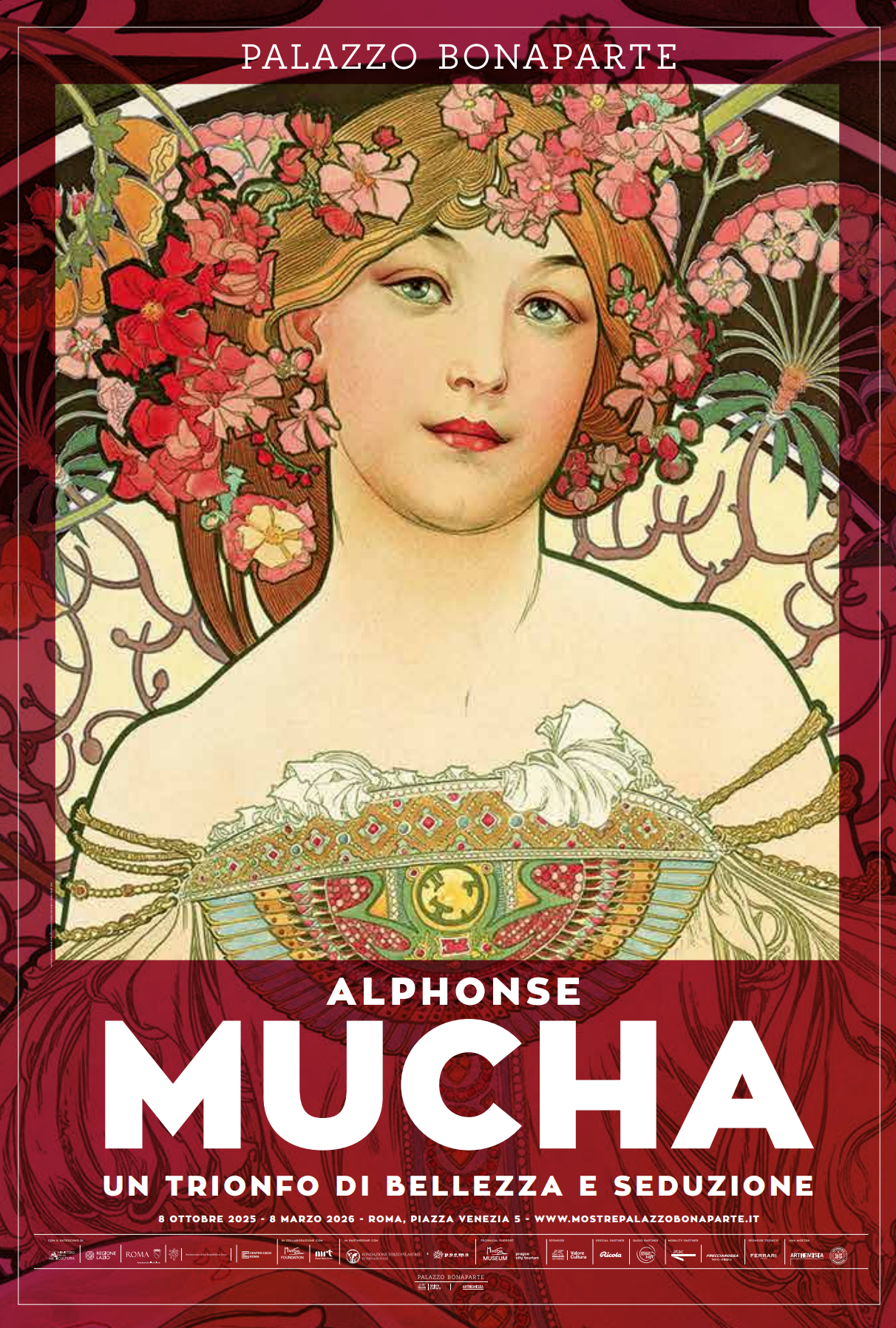 Dall’8 ottobre 2025, Palazzo Bonaparte di Roma si trasforma nel tempio dell’Art Nouveau con Alphonse Mucha. Un trionfo di bellezza e seduzione: la mostra più ampia e completa mai realizzata su Mucha, con un panorama allargato ai grandi artisti di ogni tempo che si sono confrontati con il tema della bellezza e della seduzione femminile.
